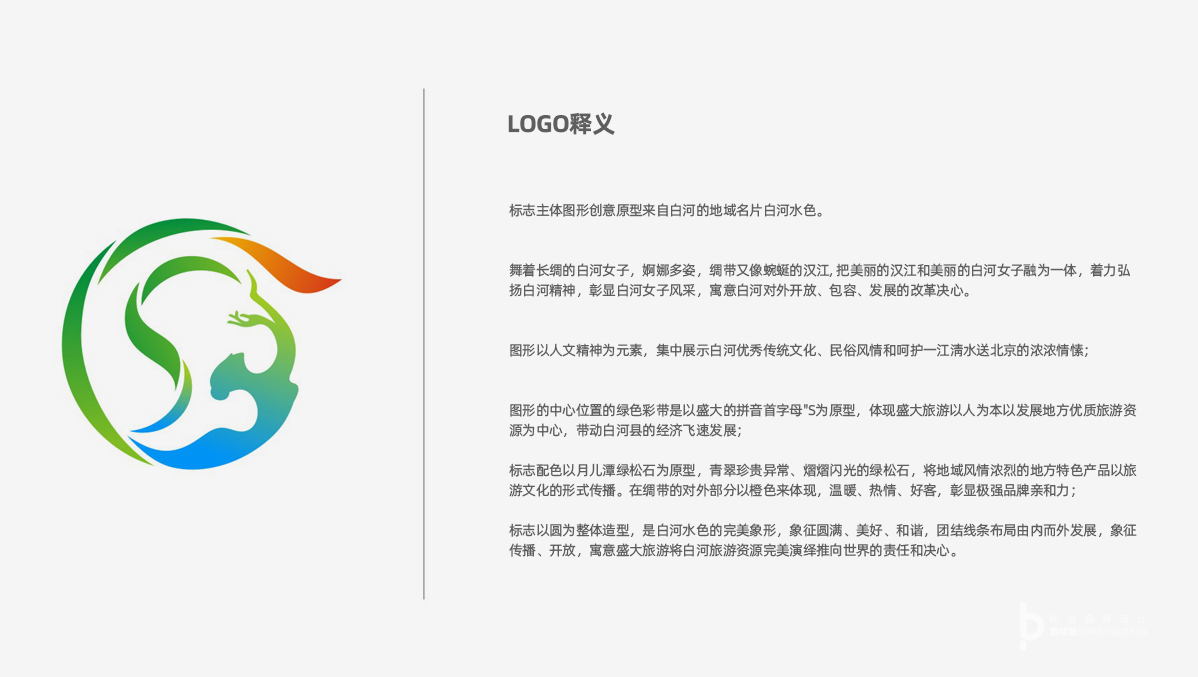 標志以圓為整體造型,是白河水色的完美象形,象征圓滿、美好、和諧,團結線條布局由內而外發展,象征傳播、開放,寓意盛大旅游將白河旅游資源完美演繹推向世界的責任和決心。