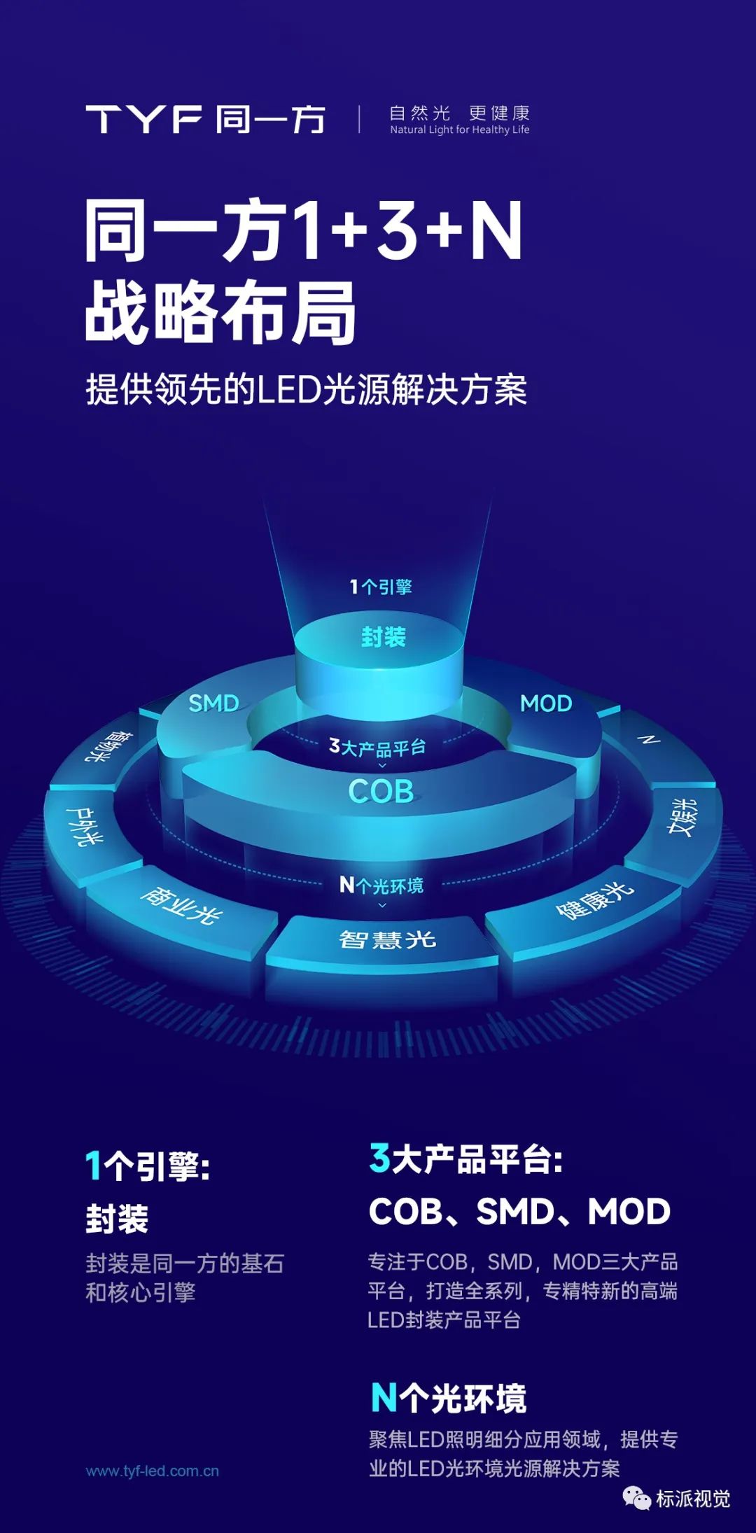 同一方始終堅持“1+3+N”戰(zhàn)略布局。1個核心:以封裝為基石和核心引擎;3大產(chǎn)品平臺:COB 、 SMD 、 MOD 全系列專精特新LED 封裝平臺;N個應(yīng)用場景:智能照明、健康照明、植物照明、商業(yè)照明、戶外照明、文娛照明等。堅守LED通用照明市場的深耕與發(fā)展,探索LED 照明細分應(yīng)用領(lǐng)域的創(chuàng)新,為行業(yè)提供更專業(yè)的 LED光源光環(huán)境解決方案。